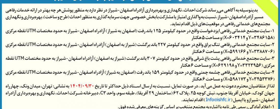 شرکت احداث، نگهداری و بهره برداری آزادراه اصفهان- شیراز در نظر دارد به منظور پوشش هر چه بهتر درارائه خدمات رفاهی مسیر آزادراه اصفهان شیراز،نسبت به واگذاری امتیاز یا مشارکت با بخش خصوصی جهت سرمایه گذاری به منظور ا حداث (طرح وساخت )، بهره برداری و نگهداری مجتمع های خدماتی رفاهی در مسیر آزاد راه به شرح فوق اقدام نماید.